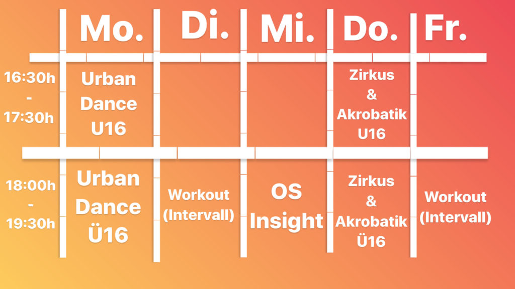 Hinzu gekommen sind die beiden U16 Kurse „Urban Dance“ (Montag) und „Zirkus & Akrobatik“ (Donnerstag). Außerdem findet „OS-Insight“ jetzt Mittwochs einmal pro Woche statt, dafür ist am Freitag eine weitere Einheit Workout hinzugekommen.